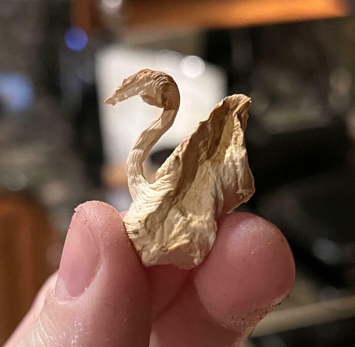 Mushroom resembling an owl in grass, showcasing pareidolia.