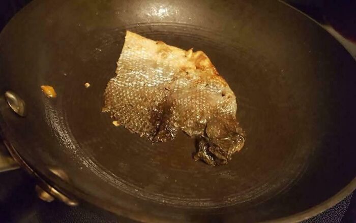 A fish fillet in a pan resembles a face due to pareidolia effects.