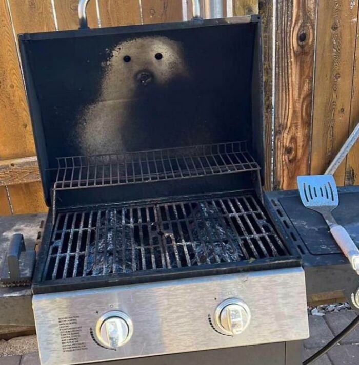 Grill with soot pattern creating a face, a classic example of pareidolia.