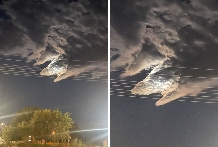 Clouds resembling a face in the sky above a tree line, showcasing pareidolia-pictures.