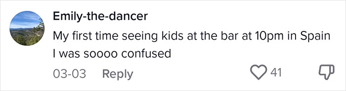 Load More Replies...As someone who has lived +40 years in Spain, children used to know how to behave in public. Now you see more bratty kids than ever. I work in education here and parents have pretty much given up, because it's not easy (has never been) to set boundaries. The cultural aspect is really true. Kids will adapt to parents' schedule. I find that healthy vs. my kid is my identity mentality. And there's parks galore so playing outside is still a daily routine for most. Overall, l think parents and kids are fairly happy here.