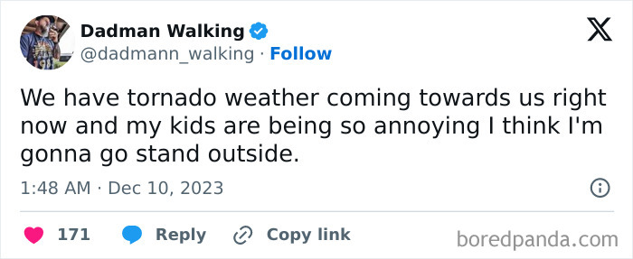 While nobody is arguing that being a parent is hard as nails, there are ample reasons to celebrate it. And, if you ask me, dad versions of sarcasm, satire and other amazing forms of humor wrapped up into spot-on posts on X is the way to go.