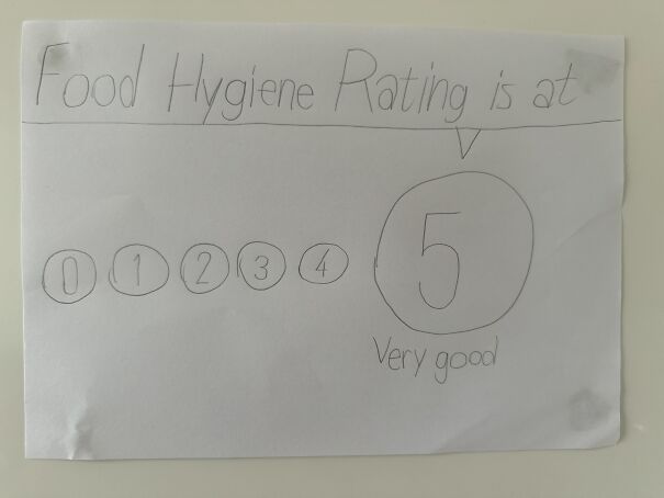 My son has developed a fascination with the food hygiene system we have in the UK. Anywhere that sells food has to display their rating which ranges from 0 to 5. He deemed our kitchen at home a 4. However after much an extensive appeal and cleaning up the crumb that only he could see, he upped us to a 5. Also this morning: Me: *softly* "Good morning, time for get up". HIM: "Sorry, I'm not here right now, leave a message". Then he pulled the duvet over his head. FoodRating...28e628.jpg