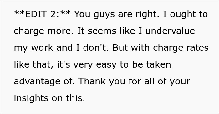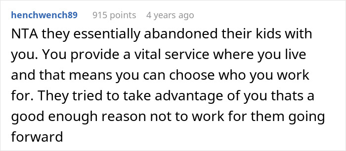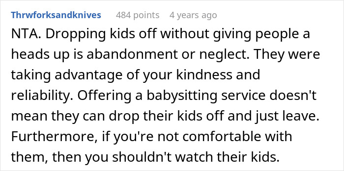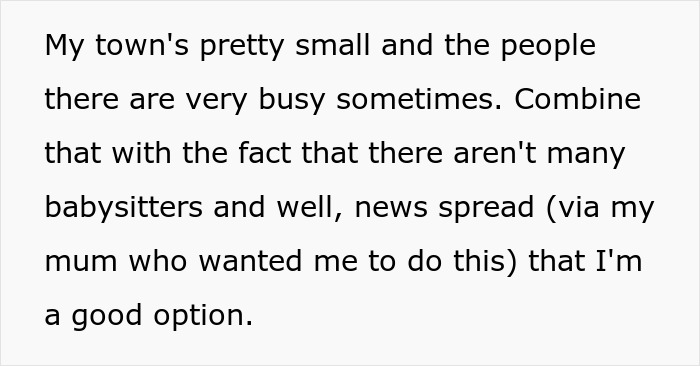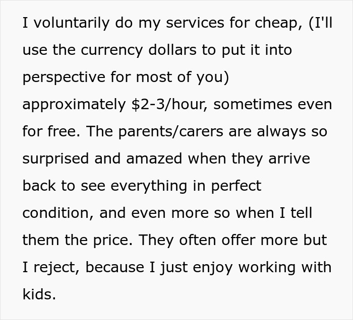 Load More Replies...Can totally believe parents taking advantage. Was a babysitter once who had a fixed day to take kids home from school and look after them (including dinner) until the parents came home. They had neighbours with three kids (one child under 3 years old, still in diapers). I babysat for them as well sometimes. Well, every time I was outside with the two kids from the one couple, they'd send out their own kids on the street and leave for errands. I stopped playing with the kids on the street and ended up going to a park for outside time. Then one time they were going to get married and asked me to watch their kids after the ceremony during the party. Sure thing, except they didn't have food ready for the kids so I had to go to the store with them for that. Then later in the evening there were suddenly like an extra 6 to 8 kids in the house, from friends of theirs since they had told them they had a babysitter. I never babysat for them again after that, that was the final straw.