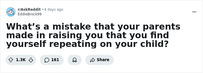 Today’s list is more about the latter. We’ve collected responses from a recent Reddit thread in which people shared the parenting mistakes they’ve experienced and later realized they’ve repeated with their own kids.
