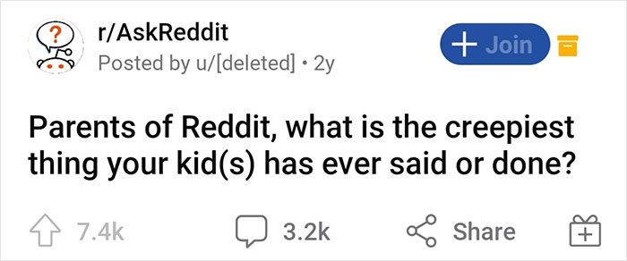 Created by a now-deleted user, it asked parents the question: "What is the creepiest thing your kid has ever said or done?" Turns out, real children can give you the spooks just as much as fictional ones.