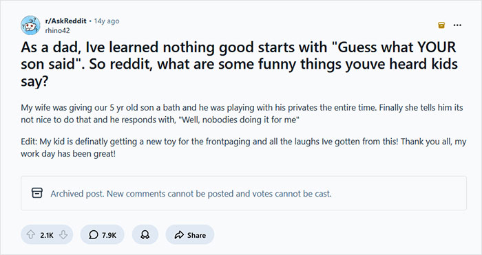 This collection of witty phrases, children's reactions, and totally unexpected comebacks was inspired by a long-running thread on AskReddit, where the topic starter addressed netizens: "As a dad, I've learned nothing good starts with 'Guess what your son said.' So, what are some funny things you've heard kids say?"