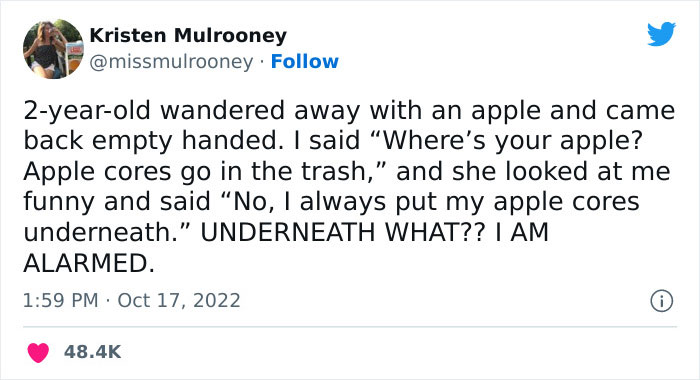 Humor writer and editor Kristen Mulrooney started up a hilarious but bizarre thread on Twitter that perfectly fits the mood this Spooky Season(™). She shared that her 2-year-old daughter hides her apple cores in an undisclosed area. The only clue is the word ‘underneath’... and it raises a ton of questions.