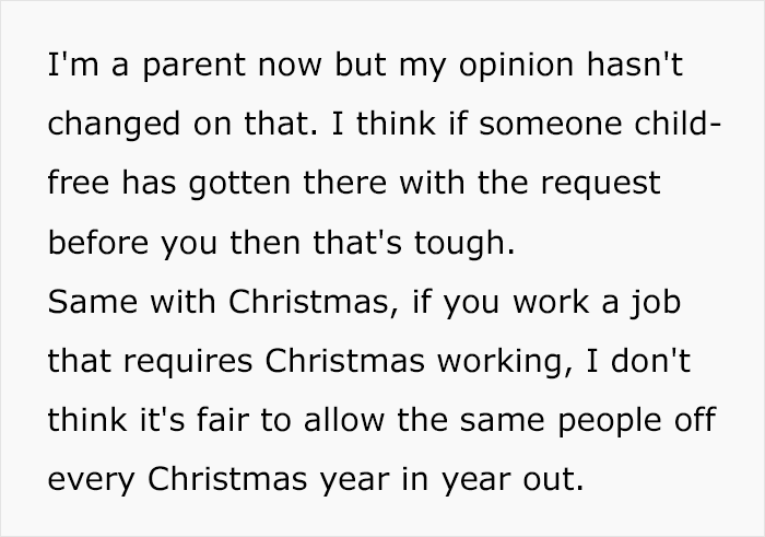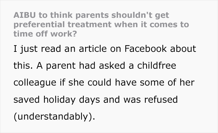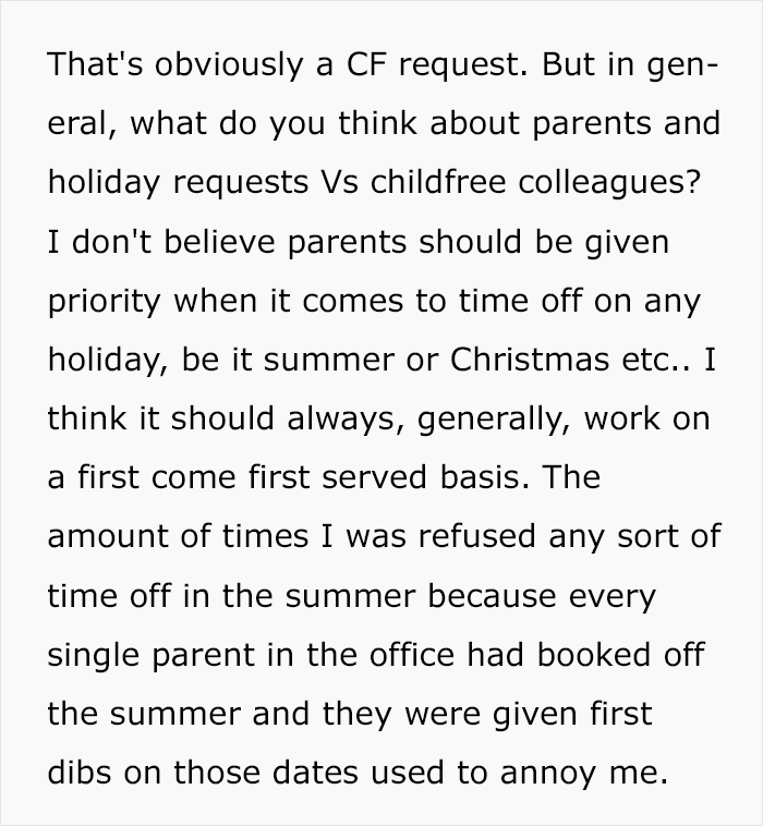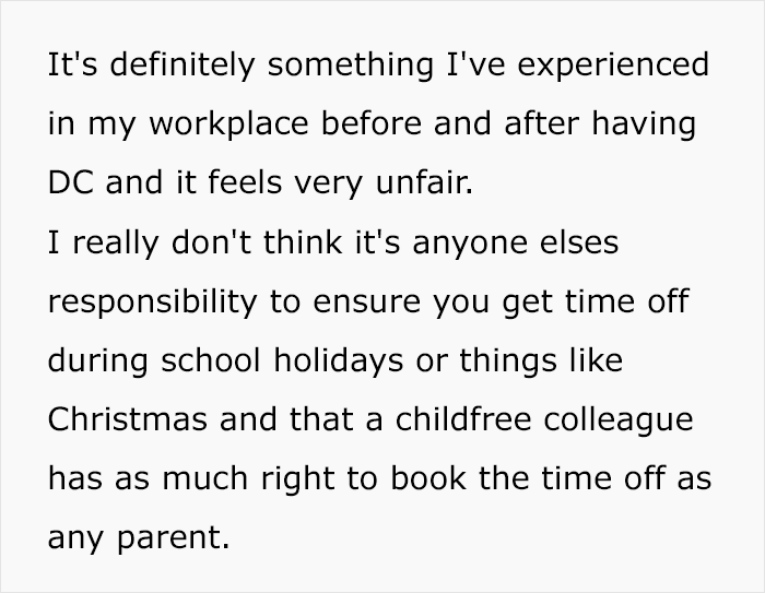 Even though discrimination based on someone’s family status is illegal in many places (though completely fine in others), some managers still give preferential treatment to those employees who have children. One mom, who goes by the name KwestTurkey on Mumsnet, called out this practice, despite being a parent herself. She said that it is was completely unfair to prioritize parents’ requests for time off and that everyone should be treated on a ‘first come, first served’ basis. Her post started a discussion and got people debating this topic.