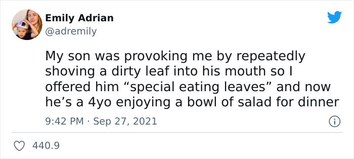 After seeing him "provoking" her by repeatedly putting a dirty leaf in his mouth, Adrian decided to make the most out of his mischief and offered him "special eating leaves" instead. Just like that, Adrian successfully made her son eat an entire bowl of plain old salad.
