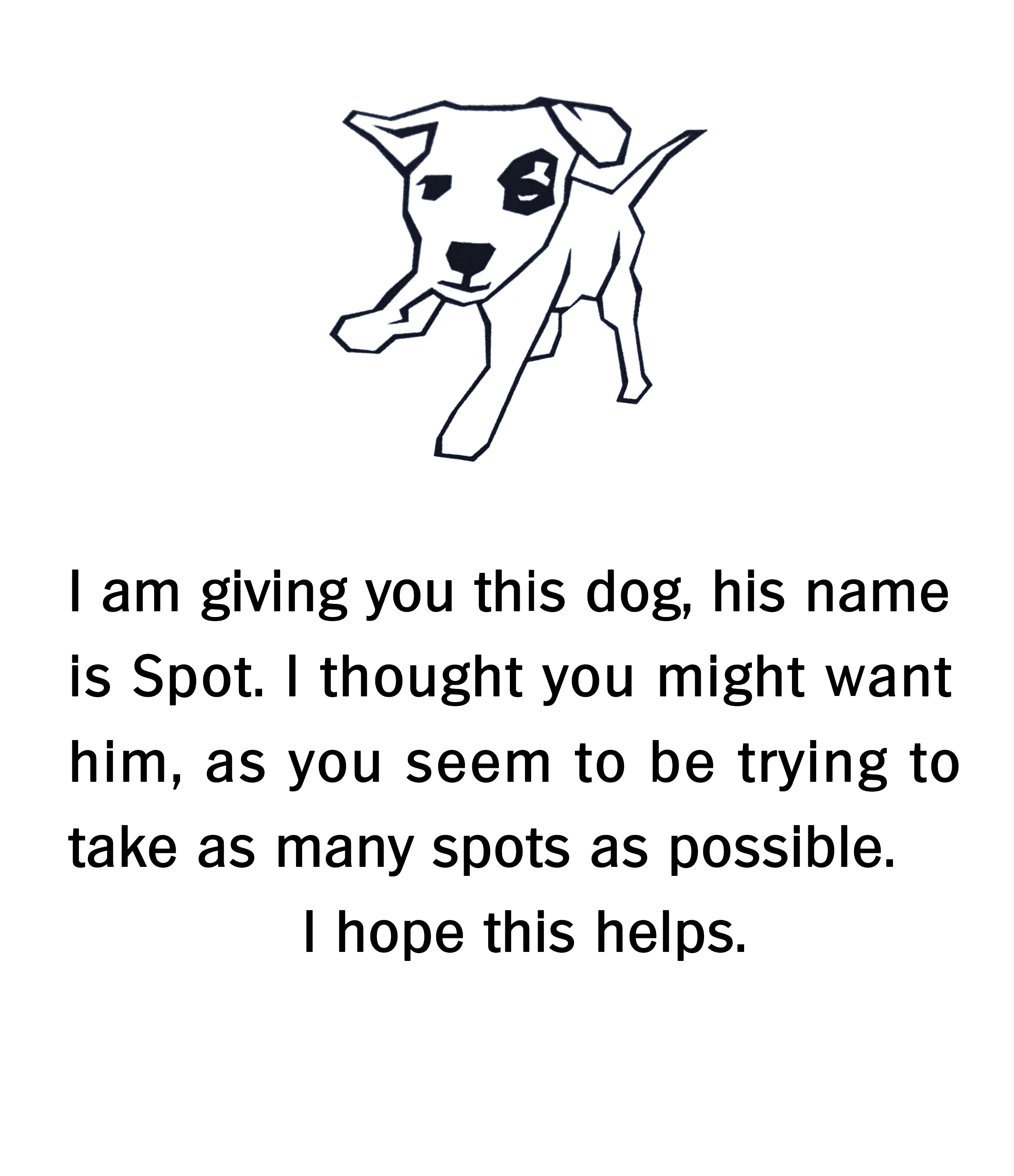 “I am giving you this dog, his name is Spot. I thought you might want him,” – writes the clever note. However, the message takes a sudden plot twist: “…as you seem to be trying to take as many spots as possible. I hope this helps.”