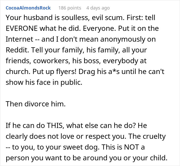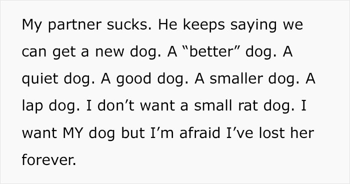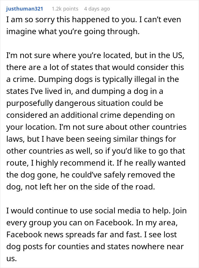 Load More Replies...I wish this poor woman all the best, and I hope her ex is only allowed supervised visitation with that kid. Dumping a dog like this shows extreme lack of empathy and compassion. There's no excuse. Also, the dog peeing in the house? That makes me think he was neglecting to let it out when she wasn't around, or outright abusing it. She should be asking herself how many times did she come home to find the baby in a wet nappy, or crying in their crib because ex-partner didn't want to deal with them.