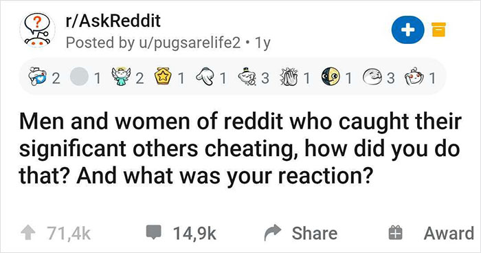 So when pugsarelife2 asked the men and women of Reddit who caught their SOs cheating to share their stories, the answers flooded in. More than 14.9K people started telling how they found out that their partner had been unfaithful, and its equal parts hurtful and infuriating.