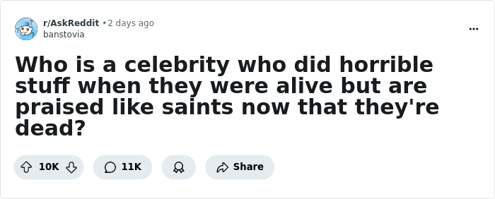 And strangely enough, nothing seems to clear a celebrity’s reputation quite like their passing. That’s the theme of this viral Reddit thread, where people are naming famous figures whose shady histories were conveniently forgotten once they were no longer around.