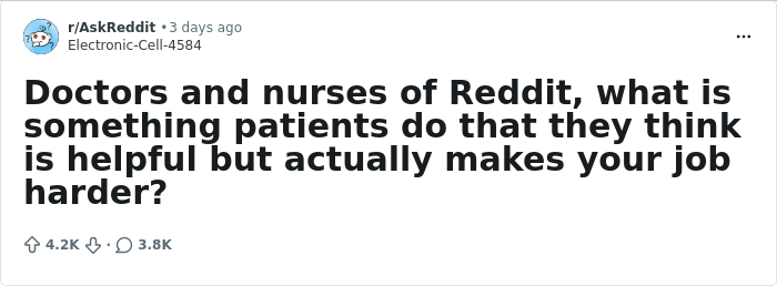 However, sometimes that willingness to help can become rather pointless or even bothersome. Patients may think they're doing medical workers a favor but are actually making their jobs way harder. To shine a light on that topic, one netizen recently asked medical professionals online: "Doctors and nurses of Reddit, what is something patients do that they think is helpful but actually makes your job harder?"
