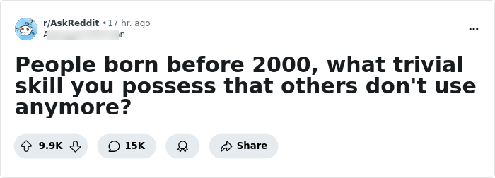In a recent thread in the AskReddit community, the user u/Aryan_Anushiravan decided to ask: "People born before 2000, what trivial skill do you possess that others don't use anymore?" Apparently, the question touched a nerve with netizens, and in just a couple of days, the thread gained around 11K upvotes with over 17K comments, which, by today's standards, can well be considered a viral status.