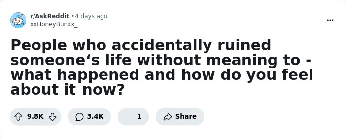 While being hyper-focused on our own lives, we can forget what an important part we play in others’ lives, whether that’s a family member, friend, or even a stranger. We have the power to encourage, teach, or uplift someone with just one word or action. At the same time, one wrong move of ours can crush dreams and even ruin people’s lives. Folks under this popular thread have been sharing how they accidentally sabotaged someone’s life without really meaning to and how they feel about it now. Scroll down to find the harrowing stories below, and don’t forget to upvote those that made you rethink your own life choices.