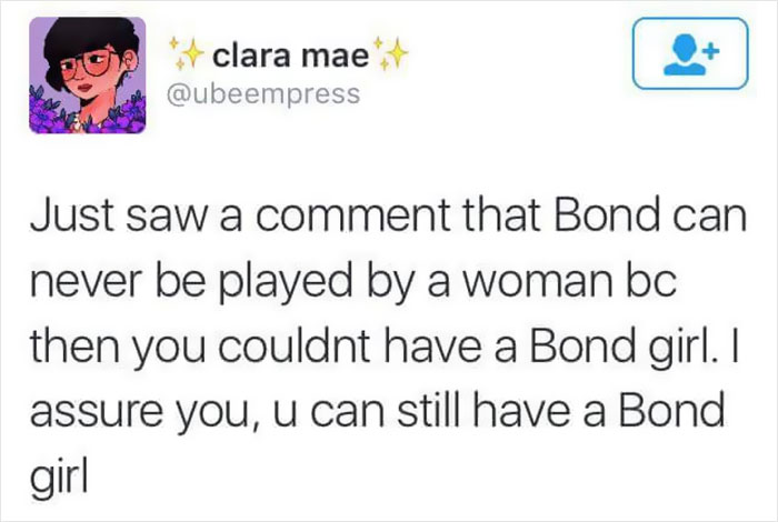 Well yeah you can have a bond girl but why does the sex object have to be just a girl, why can't it be a bond guy.
