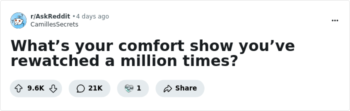 Different people have different choices when it comes to such comfort shows, so, when Reddit user CamillesSecrets asked them to list the ones they can watch over and over, folks didn’t hold back. What did we do? We compiled a list of the best ones for you, of course! Just scroll down, and check them out!