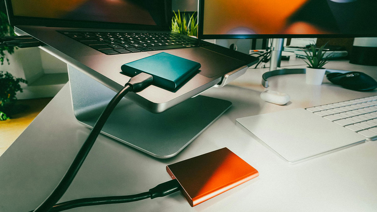 Laptop connected to colorful external hard drives on a desk with a keyboard and mouse nearby. Guy in my class about 10 years ago. Not so much on the spectrum as the spectrum was on him.