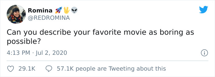 But the filmmaker Romina decided to turn this all over. Instead of hyping up their all-time fave films, she asked people on Twitter to share the most boring descriptions of them. The thread quickly blew up with 66.2K retweets and comments and 29K likes.