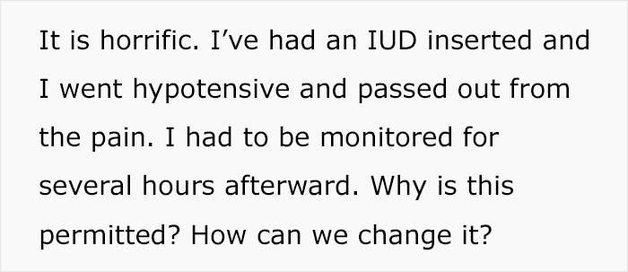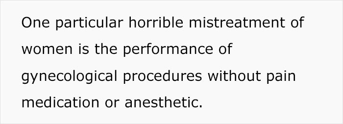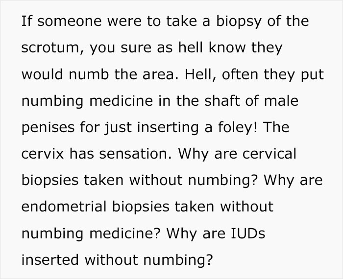 u/Ancient-Abs told Bored Panda they discovered this "when I myself underwent an IUD insertion and then had significant pain during and afterwards. My doctor acted like I was an exception and that most women felt nothing, but as I asked my friends, I discovered that multiple women have pain and that numbing the area is possible but doctors don't do it."