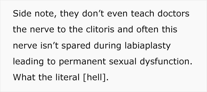 After going through all the replies under their post, u/Ancient-Abs took away that "if we want to change this, we have to write the American College of Obstetrics and Gynecology in order to have them require doctors and doctors in training to numb these areas before procedures." If you want to stay on this topic, keep an eye out for a letter template the Redditor will draft that people can sign and send to this group.