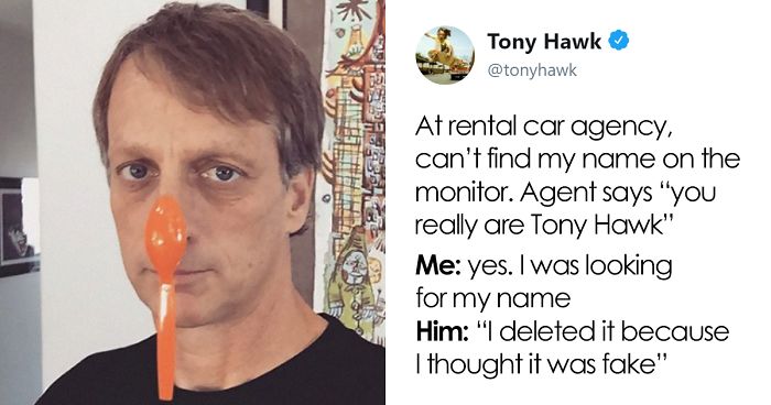 Tony Hawk. Where do we even begin? This American skateboarder, actor, and owner of the company Birdhouse has become probably one of the most recognizable symbols of the ’90s. But times change and not everyone today knows who he is. Tony, however, doesn’t feel threatened by this fact. On the contrary, he’s quite fond of it. Just check out at the ways he tweets some of the situations where people have no idea who talking to!