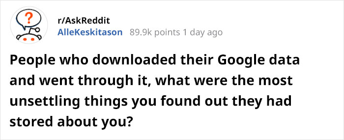 Load More Replies...Reddit user AlleKeskitason asked other community members that had downloaded their Google data, what the most unsettling things they found were. Incredibly, people replied. And their responses were both hilarious and deeply disturbing. For example, one Redditer found out that they’re the “vice-president” of a company they’ve never heard of. While another person found some recordings of their computer’s fan spinning. Spooky, right?