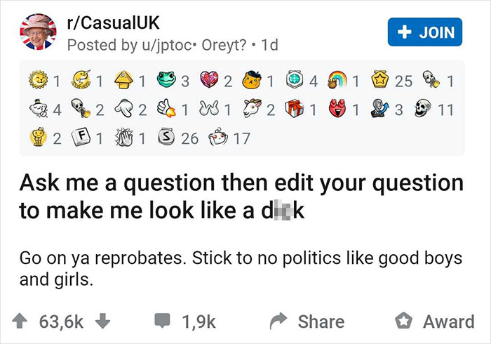 That’s exactly what Reddit user Jptoc asked his fellow internet users to do to entertain them during the quarantine. Jptoc told people to ask them a question and then to edit it to make them sound like a complete jerk with their answer. The thread was wildly popular on the r/CasualUK subreddit, with over 63.6k upvotes in a single day and more awards than we could count.