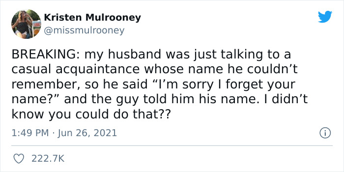 Has it ever happened to you that you forgot a person’s name immediately after someone told it to you? Well, you’re not alone. Below is a list of posts shared by people on Twitter as a response to a viral Tweet. Kristen Mulrooney, who goes by @missmulrooney on Twitter, shared a simple story of how her husband just simply said "I’m sorry, I forget your name?" But turns out that people on the internet have more stories related to forgetting people’s names and even more clever hacks for getting themselves out of a potentially embarrassing situation. Don’t forget to vote for the best posts and leave your comments!