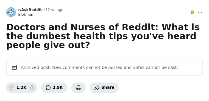 There's a popular thread online where the topic starter, user u/Blotman, asks netizens: "What is the dumbest health advice you've heard people give out?" The author's original target audience was doctors and nurses, but it turned out that ordinary people with no connection to medicine had also witnessed incredibly strange "medical" advice.