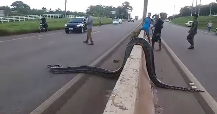 Multiple videos appeared on Facebook from people who watched the snake embarking on its dangerous journey through the busy roadway. As the anaconda made its way across multiple lanes, it climbed over the guardrail into the center of the road and made its way to safety to the other side of the street.