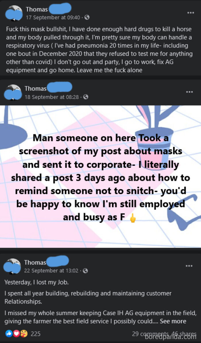 Facebook Friend Is An Anti-Masker Who Brazenly Posts About Keeping His Job Even After Complaints About Him To Corporate. He’s Not So Cocky A Few Days Later