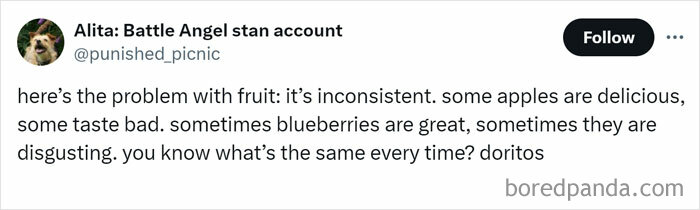 I woldnt know, they dont sell doritos here, so the taste is consistently nonexistent