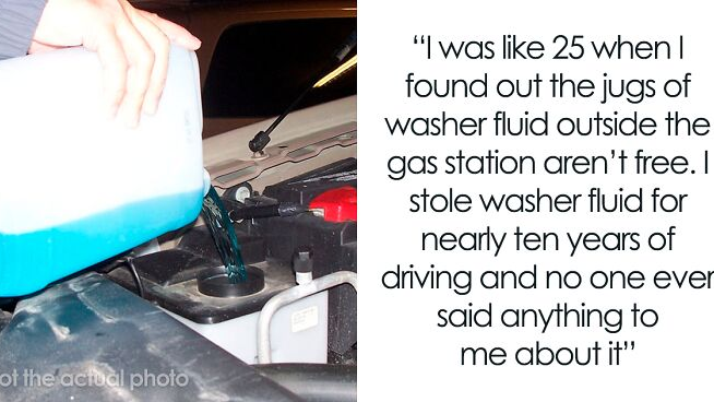 I was like 25 when I found out the jugs of washer fluid outside the gas station aren’t free. I was walking out of the gas station with a buddy one day, grabbed a jug of washer fluid, and he asked me “did you just steal that?” And I was like “No, dude, it’s free”. It’s not, I stole washer fluid for nearly ten years of driving and no one ever said anything to me about it.