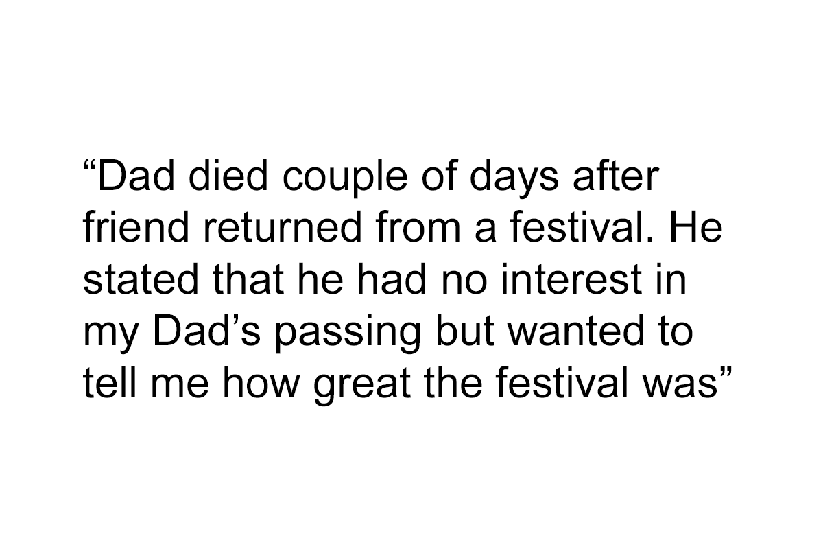 2006 my then best friend wanted to go to a big German metal festival. I did not want to go because my Dad had endstage cancer. Dad died August 8th, couple of days after friend returned from the festival and I called him because I needed someone to talk. He very bluntly stated that he had no interest in my Dad's passing but wanted to tell me how great the festival was. You can't imagine how disappointed I was. For years I've been there for him whenever he got dumped and the one time I needed a friend he wasn't there for me. Told him to shut my door from the outside and loose my number...