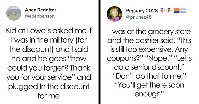 The tweet went pretty viral and inspired other people to share their own stories. There were people who also got military discounts just for knowing someone who is in the military or because the reason for buying certain things made the retail workers laugh. Retail workers would insist on finding an excuse to give something for free or at a lower price.