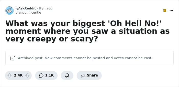 Someone asked “What was your biggest 'Oh H**l No!' moment where you saw a situation as very creepy or scary?” and people online shared their stories. Be warned, some of these are dark. So settle in as you read through, upvote the scariest and be sure to add your own stories and experiences to the comments down below.