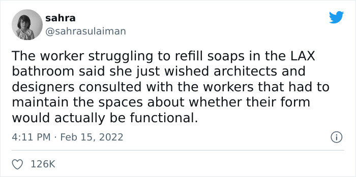 Recently, Sahra Sulaiman, the communities editor for Streetsblog L.A., shared an illuminating thread about soap dispensers in LAX bathrooms. “The worker struggling to refill soaps in the LAX bathroom said she just wished architects and designers consulted with the workers that had to maintain the spaces about whether their form would actually be functional,” she wrote in a tweet amassing 126k likes.