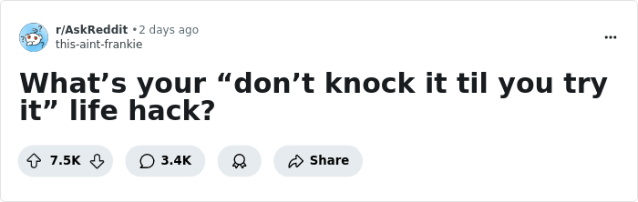 A few days ago, Reddit user This-Aint-Frankie asked the internet, "What's your 'don't knock it ’til you try it' life hack?" The comment section quickly filled with clever, unusual, and genuinely useful tips. If it sounds stupid, but it works, it isn't stupid!