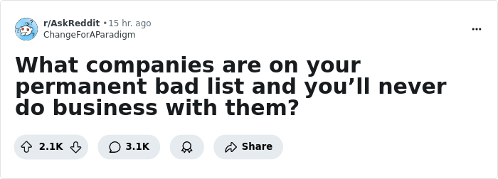 All of these takes were collected from an online discussion, which happened under the question “What companies are on your permanent bad list and you’ll never do business with them?” Since it got nearly 4K answers, we thought it would be reasonable to turn the most interesting answers into an entertaining (and possibly educational) list.