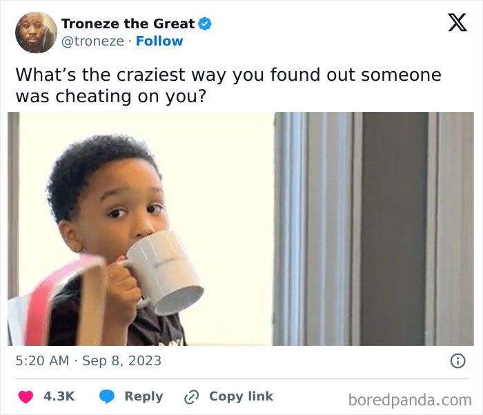 Netizens on X (formerly Twitter) recently discussed such ways, after one user asked them to share the craziest stories about how they learned their partner was cheating. Despite it being a rather painful thing to go through, quite a few people opened up about their experiences, so if you're curious to read their stories, scroll down to find them on the list below.