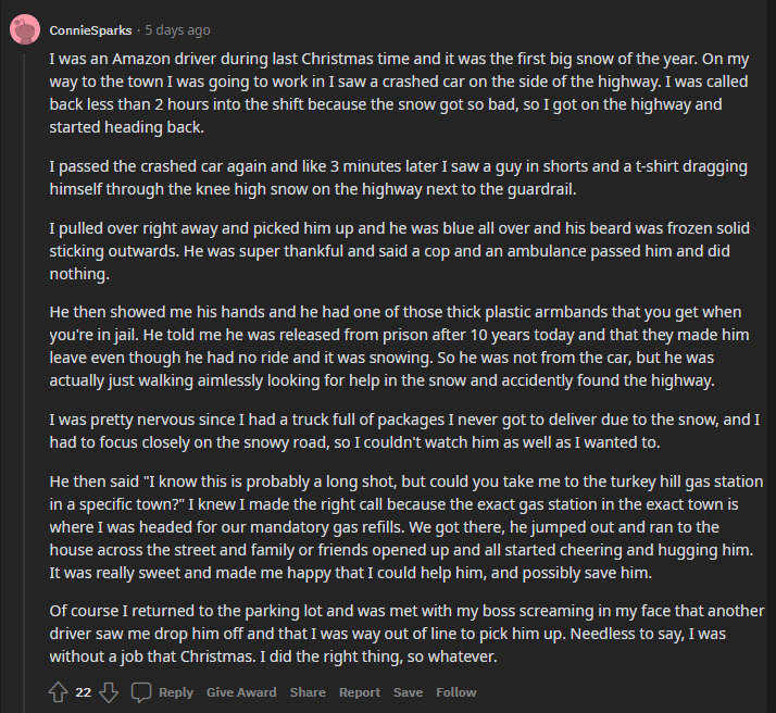 A few years ago, I was at my lowest point in life. Several people close to me had passed away unexpectedly, I was being bullied every day at my job, my life was falling apart. I was past being depressed - I just couldn't imagine waking up another day. So I'd planned my s*icide - bought a one-way plane ticket, got sleeping pills, and wrote a series of s*icide notes. On the day I was to fly out to fulfill my 'plan', there was a terrible accident on the freeway to the airport. It was shut down both ways. So I drove into a nearby pub to have a beer and wait out the traffic. The second I sat on the patio with my drink, a gentleman asked if he could sit with me. Whatever, I thought, sure, who cares. He told me that whatever I was doing next was a terrible idea and I would regret it. I thought, who is this random f**ker? But I listened. He said that he sensed I was in pain, but that I had an incredible life ahead of me, and that this was not the way my story was supposed to end. Again, I'd never met this guy in my life, and hadn't mentioned a word to him about my 'plan'. He asked me to hand him my keys and my wallet, and he'd give them back to me after I talked and he listened. I poured my heart out to this random guy. Told him all my traumas and pains in life and why I was heading to the airport on a one-way ticket to kill myself in a cemetery across the country where my family was buried. He just listened. And then he pulled out a lighter, asked me to pull out my s*icide letters and helped me burn them. He told me I was worth so much to the world and that after I finished my drink, I needed to head home and get some sleep. He told me I was going to be okay tomorrow, and I believed him. He then gave me my keys and wallet back. I left that afternoon and went home, hugged my family. Got some sleep - and the next day, I started working on myself - finding a therapist, a new job. Years later, I'm in a fantastic place in life, so, so far from where I was that day. To this day, no one in my life knows how close I came to killing myself. But this random stranger just somehow understood me. And saved my life. I never saw him again, I don't even know his name. It's the most unexplained thing that has ever happened to me. And I think about that guy every day - so, thank you, kind stranger, for saving my life that random September day on a pub patio.