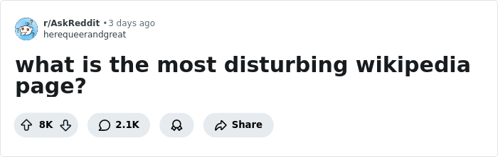 Last week, Reddit user Herequeerandgreat asked people to share the most disturbing entries they’ve stumbled upon in the online encyclopedia. Whether it’s due to the Halloween season or some internal human morbid curiosity, the discussion has caught on.