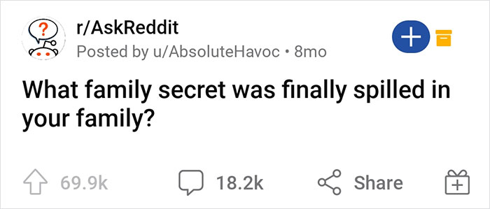 The author of the thread, u/AbsoluteHavoc, opened up to Bored Panda about what inspired them to ask the question about family secrets in the first place. "I wanted to make a thread on r/AskReddit that would gain some insight from a lot of people, but also to allow people to voice their opinions on family matters that they thought were shocking and surprising, and how it made an impact on their lives and their family lives," they told me.