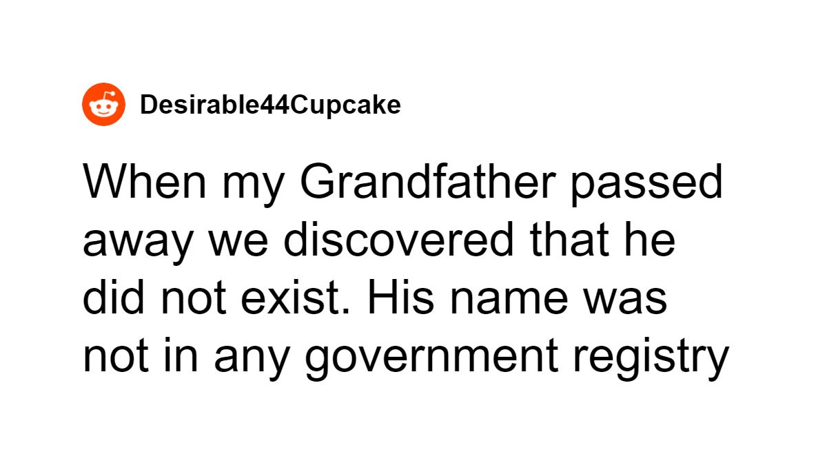 When my Grandfather passed away we discovered that he did not exist. His name was not in any government registry. He was a normal citizen, paid taxes, had a license and everything. Lived a long life, married to my grandmother for over 50 years, had multiple children, everything normal.