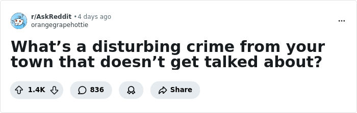 Someone recently asked, “What’s a disturbing crime from your town that doesn’t get talked about?” and the answers read like a Stephen King horror. From people chopping off relatives’ heads, to entire families wiped out in a moment of madness, and shady black market body part shops… This is the stuff nightmares are made of.