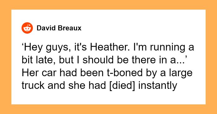 It was September 5th. In less than 24 hours, we would be going to Heather's funeral. Her car had been t-boned by a large truck and she had been k**led instantly.