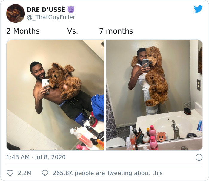 Twitter users have been capturing their fluffers in cute before and after pics, showing what a night and day difference a month or two can make. After the guy who goes by the Twitter handle @_ThatGuyFuller posted a pic of himself holding his curly goldendoodle when he was 2 months and after he reached 7 months, the thread blew up.